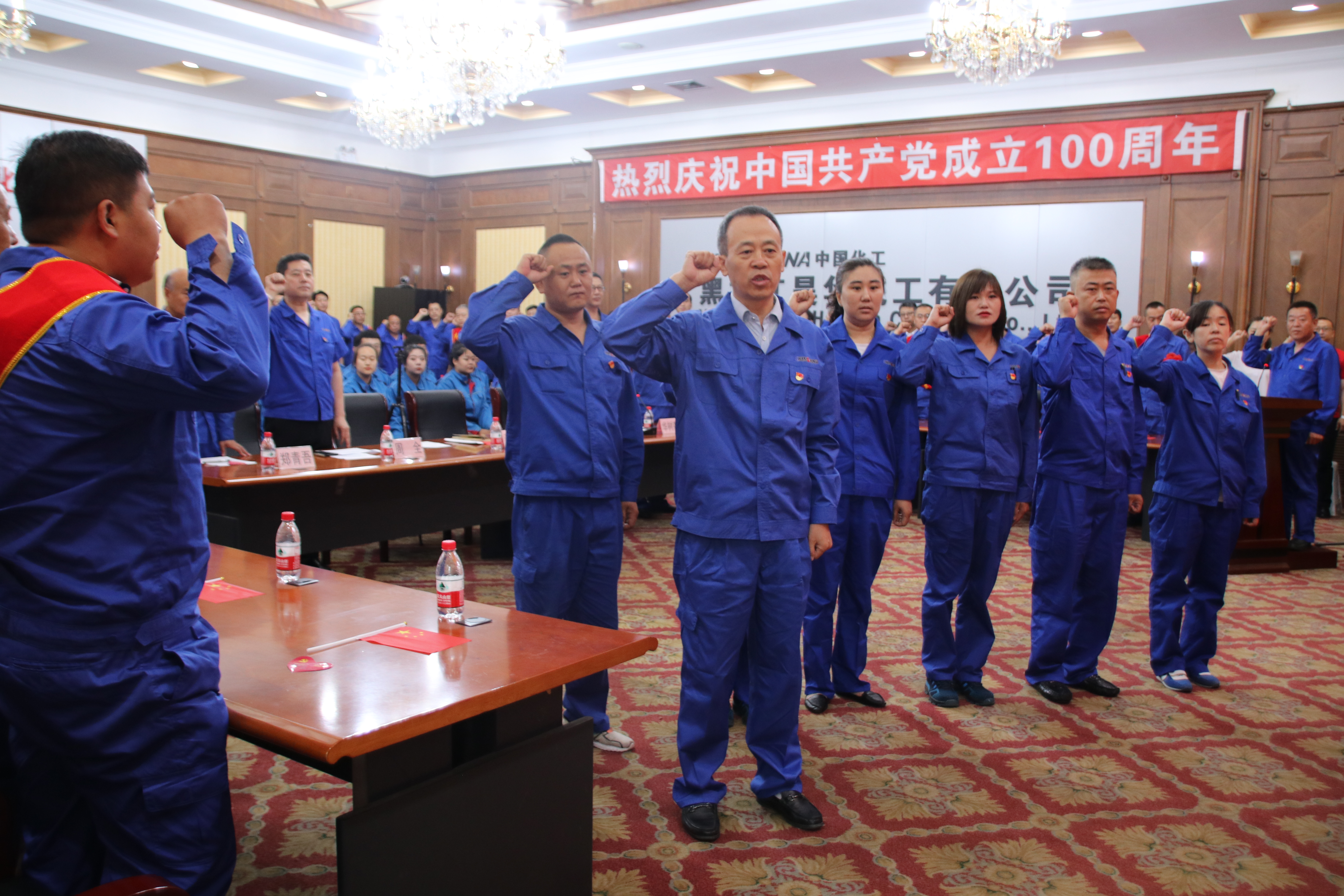 ??? 大會(huì)在全體起立奏唱國歌聲中開幕。黨委書記、總經(jīng)理劉志新帶領(lǐng)王曉紅等6名新黨員面對黨旗莊嚴(yán)宣誓,受表彰人員及公司中層以上黨員干部重溫入黨誓詞。